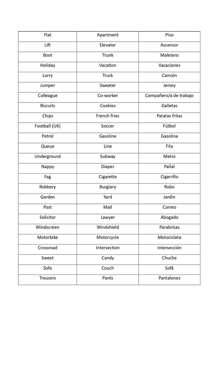 Aquí hay una lista de 20 palabras comunes que evidencian diferencias entre el inglés británico y americano: