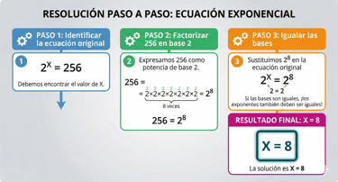 Uno de los métodos más utilizados para resolver ecuaciones exponenciales consiste en expresar ambos lados de la ecuación con la misma base y, a continuación, igualar los exponentes.