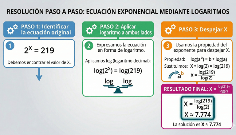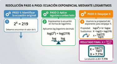 Este método consiste en aplicar logaritmos a ambos lados de la ecuación, lo que nos permite “bajar” el exponente y convertir la ecuación exponencial en una ecuación algebraica mucho más sencilla de resolver.
