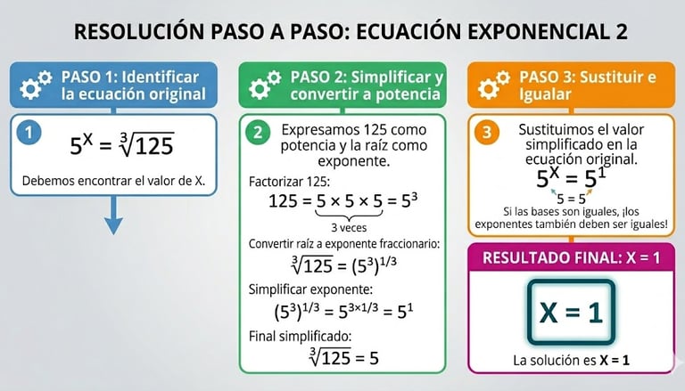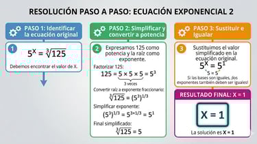 Dominar estas transformaciones es fundamental, ya que nos permite unificar la expresión de la ecuación y aplicar después los métodos habituales para resolverla. Aunque al principio pueda parecer un detalle menor, saber pasar de raíces a potencias y manejar correctamente las fracciones marca una gran diferencia a la hora de resolver ecuaciones exponenciales con seguridad.