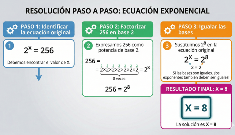 Para ello, empezamos factorizando los números hasta conseguir bases iguales o equivalentes. Cuando las bases coinciden, podemos aplicar una propiedad clave de las potencias: